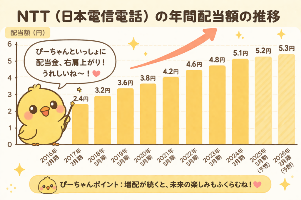 NTTは急に上がる銘柄ではないですが長期でコツコツ持つのに向いています。